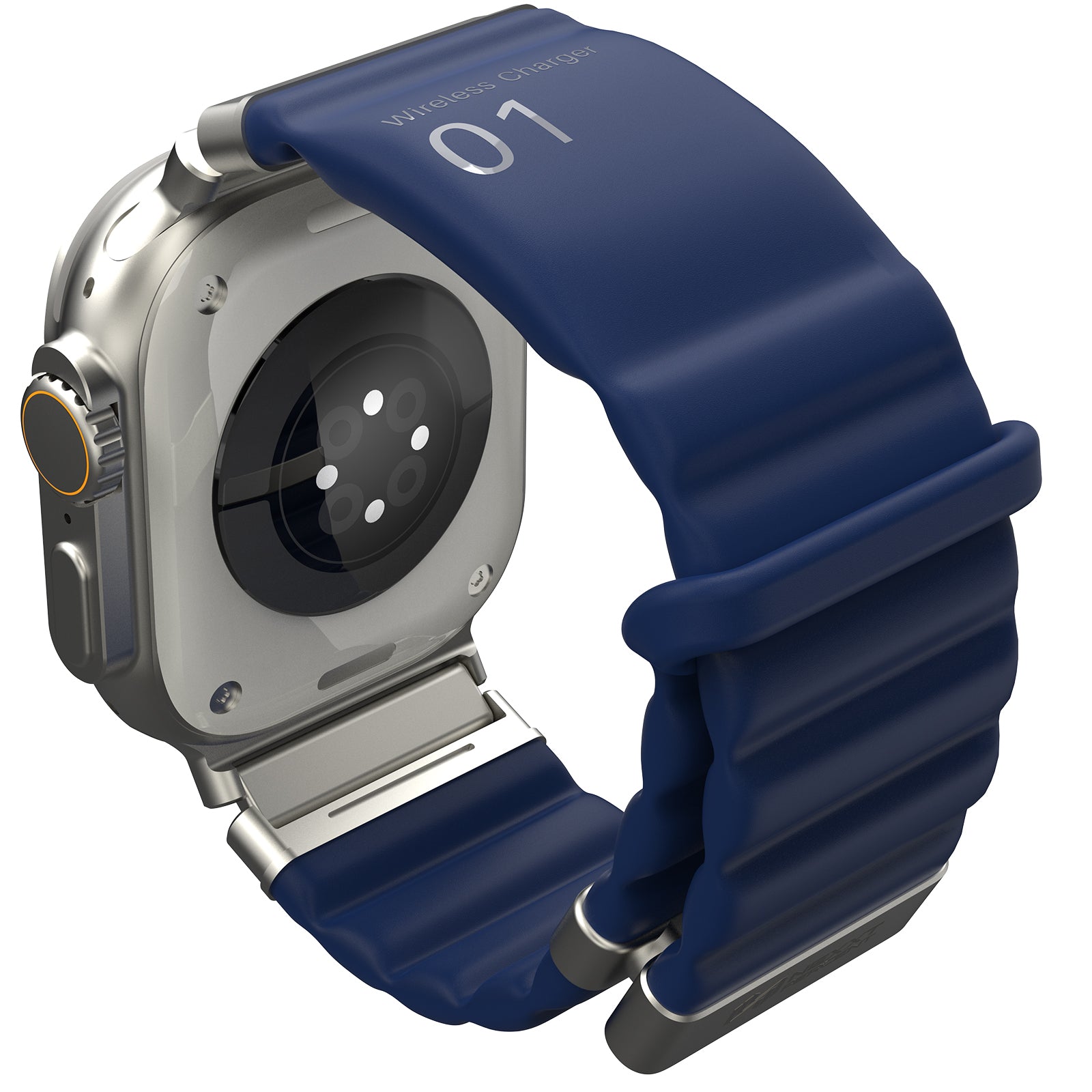 Charging your Apple Watch is simple. Just fold the band to align the wireless charger, let the magnets snap into place, plug into any USB-C port, and you're all set.